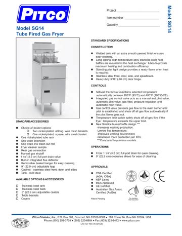 Web Manual De Instalación Y Operación De Freidores De Gas Cubre Los Modelos Sg14C, Sg14, Sg14R,Sg14T, Sg18 Sg1824, Sgc Pitco Frialator Po Box 501 Concord, Nh 03302.